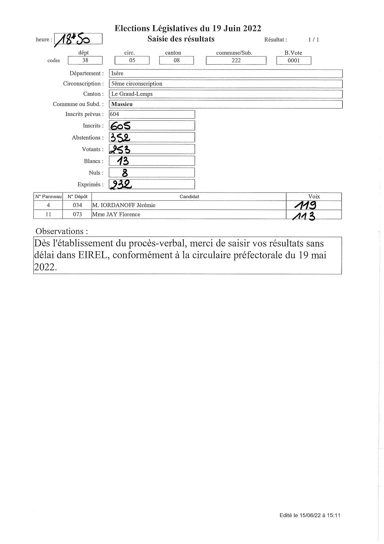 Résultats des élections municipales partielles complémentaires à Massieu : 1er tour