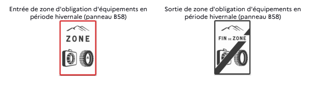 À compter du 1er novembre 2021, une nouvelle signalisation sera progressivement implantée. Elle indiquera les entrées et les sorties de zones de montagne où l'obligation d'équipements hivernaux s'appliquera. Elle sera matérialisée par les deux panneaux ci-dessous :