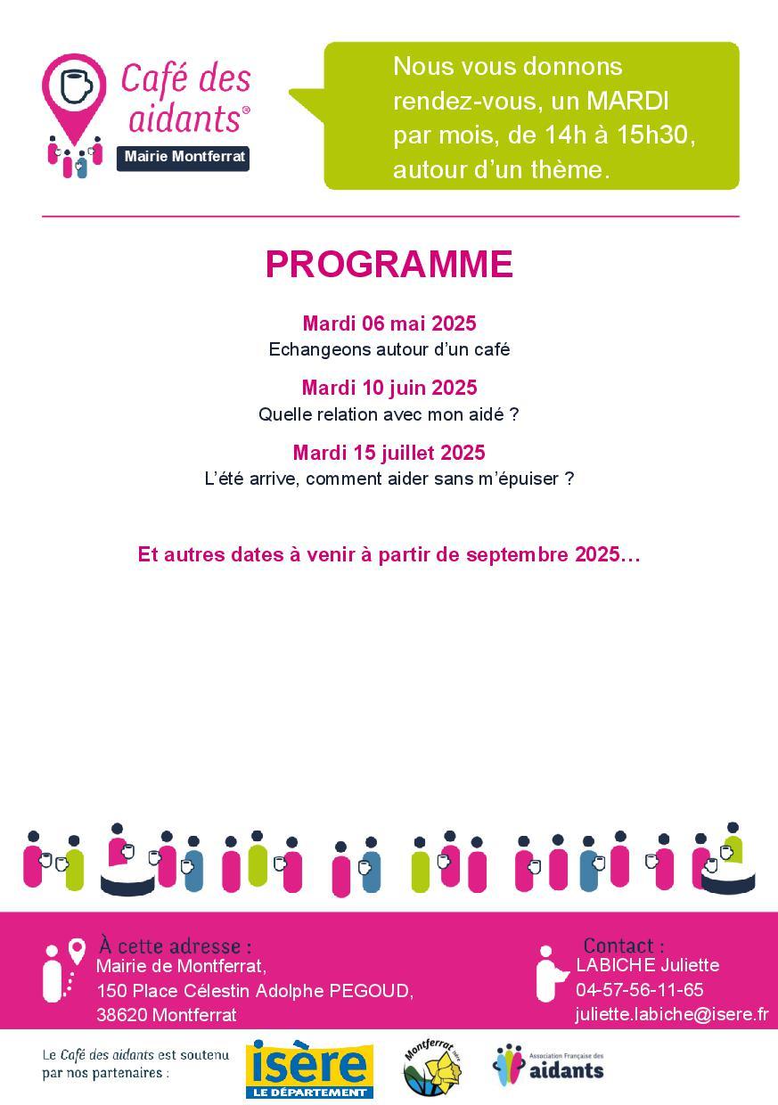 Un deuxième café des aidants s’ouvre sur le territoire du Voironnais Chartreuse. Ce nouveau café aura lieu au sein de la mairie de Montferrat à compter du 6 mai 2025 à raison d’un mardi après-midi par mois.