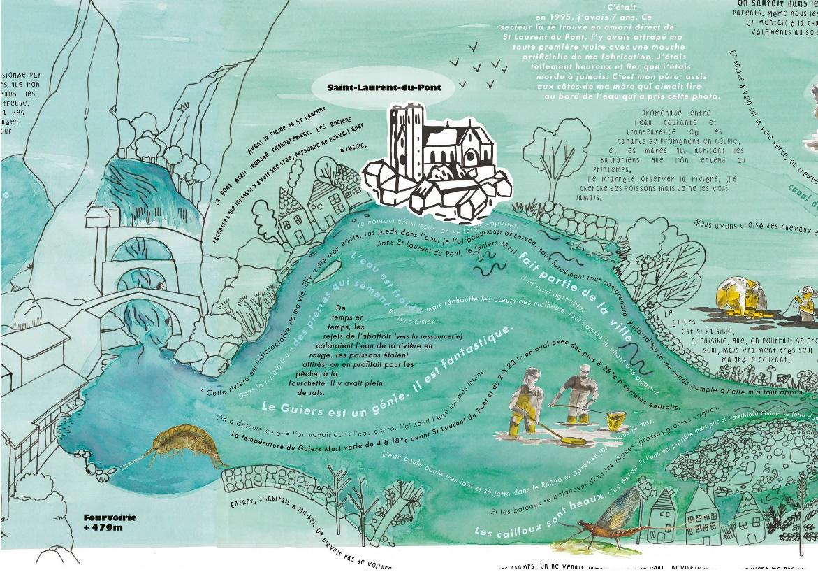 Plus de 200 dessins, écrits, photos et contributions ont permis à Ingrid Saumur et Erika Gervasoni de proposer une représentation collective de la rivière du point de vue de ses usagers : qu’ils soient natifs du territoire ou néo-arrivants, enfants ou adultes, experts ou promeneurs.
