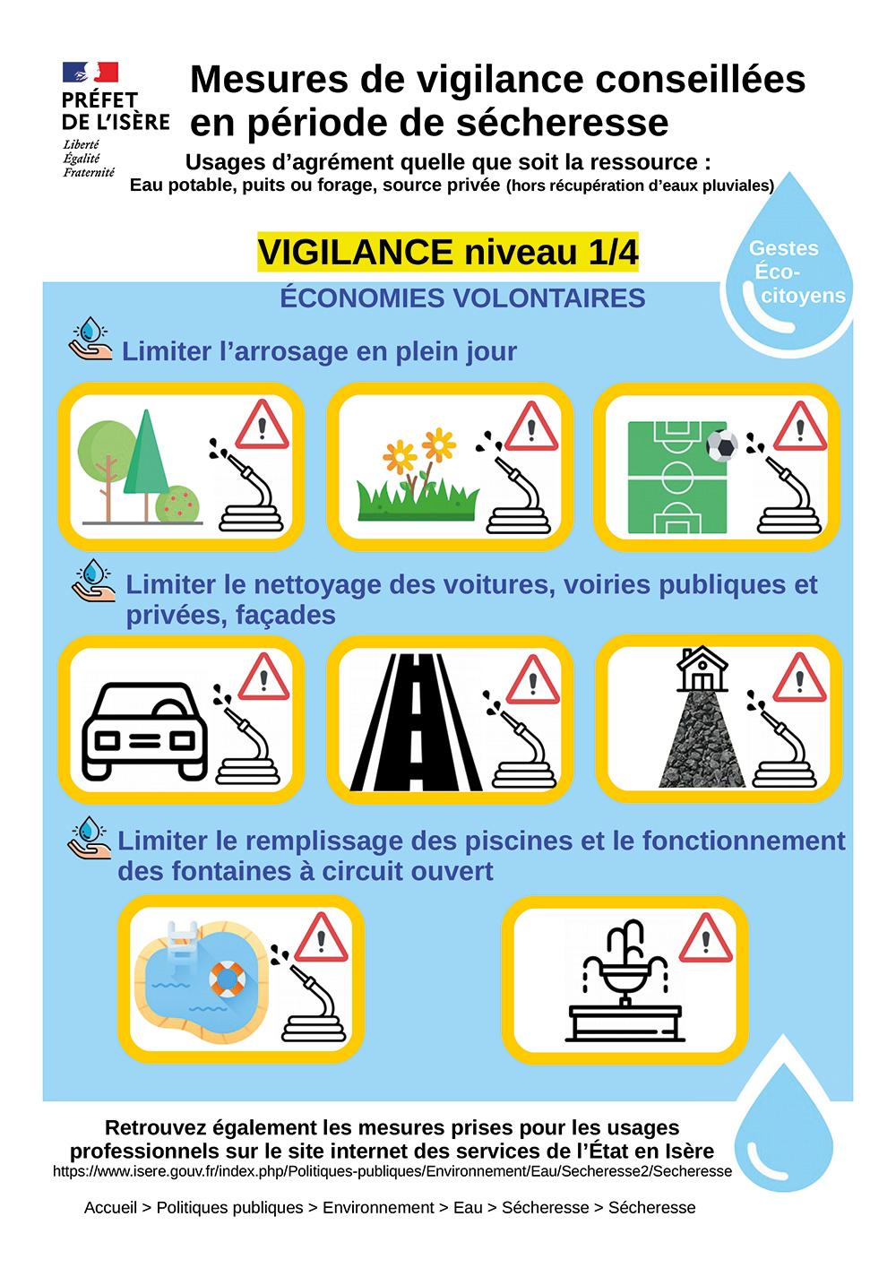 Le niveau 1 de vigilance ne s’accompagne d’aucune mesure de restriction mais chaque citoyen et chaque usager est invité à être vigilant et économe dans sa consommation d’eau. Faire preuve de civisme dans sa consommation quotidienne d’eau revient à préserver pour chacun les biens précieux que sont la ressource en eau et les milieux aquatiques.