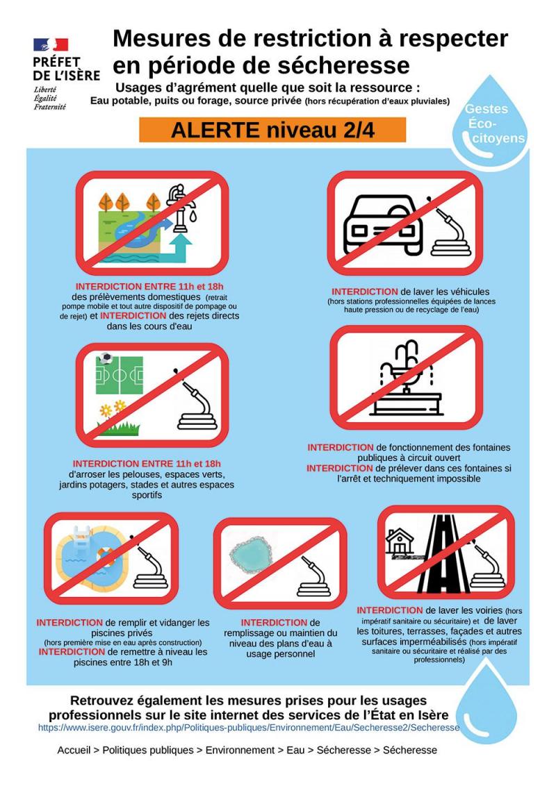 Notre territoire a été placé en alerte sécheresse par la Préfecture de l’Isère, par conséquent il est notamment interdit de :