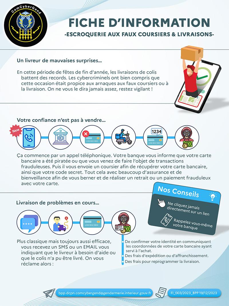 En cette période de fêtes de fin d’année, les livraisons de colis battent des records. Les cybercriminels ont bien compris que cette occasion était propice aux arnaques aux faux coursiers ou à la livraison. On ne vous le dira jamais assez, restez vigilant !