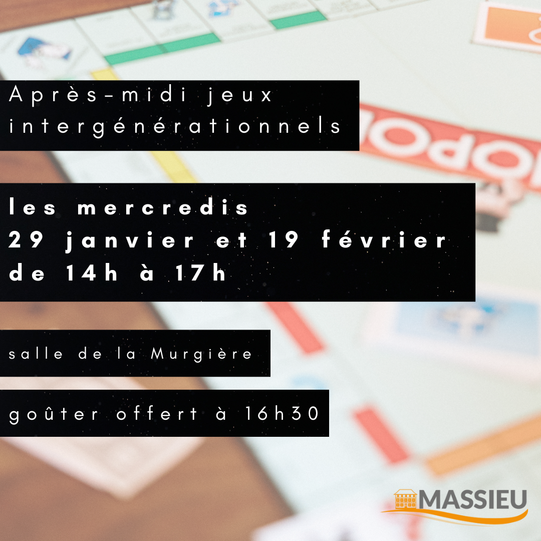 La commune vous propose deux après-midi de jeux intergénérationnels les mercredis 29 janvier et 19 février, de 14 h à 17 h, à la salle polyvalente.