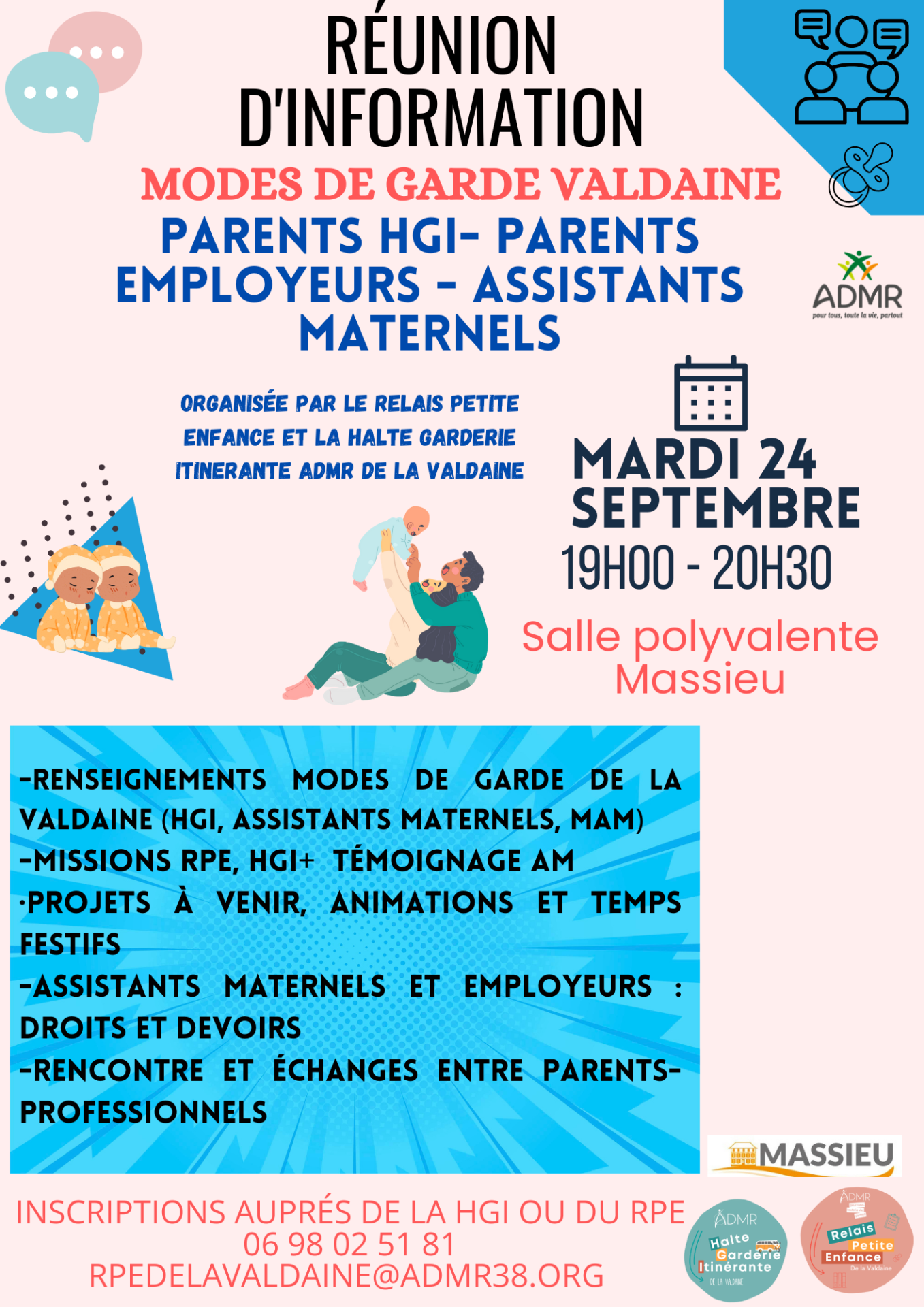 La réunion d'information de rentrée pour les assistants maternels/ parents employeurs / parents HGI se déroulera le mardi 24 septembre à partir de 19h, à la salle de la Murgière de Massieu, en partenariat avec les assistants maternels, la HGI et les familles.